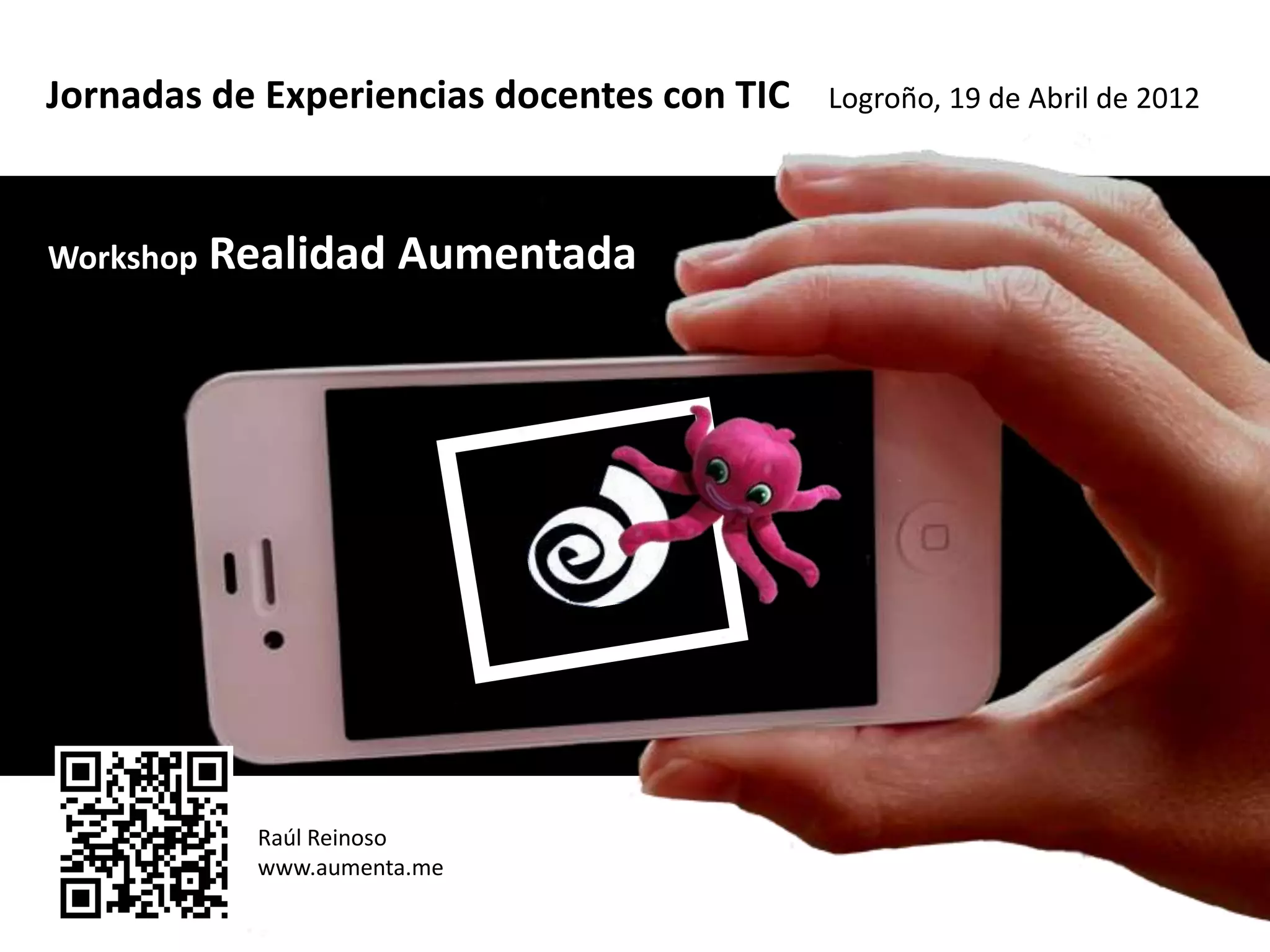 The document discusses a workshop on augmented reality held in Logroño, Spain on April 19, 2012. It introduces augmented reality, including definitions and applications for education. Examples of augmented reality tools and projects for education are presented, showing the potential of augmented reality for improving learning.