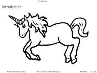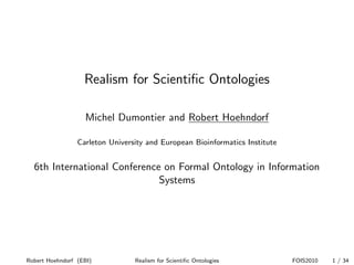 The document discusses the importance of realism in scientific ontologies, emphasizing that ontology terms should correspond to real instances and be grounded in Aristotelian universals. It highlights the challenges faced in biomedical ontologies regarding the integration and communication of scientific data, particularly with the classification of hypotheses, theories, and predictions. The conclusion suggests that strict adherence to realism can limit the applicability of ontologies in scientific discourse.