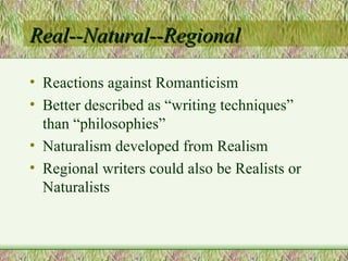 The document summarizes different American literary techniques that emerged in the late 19th century including Realism, Naturalism, and Regionalism. Realism focused on faithful representations of reality and depicting characters as ordinary people. Naturalism applied scientific principles to characterize individuals as helpless objects influenced by environment and heredity. Regionalist works aimed to capture specific locales through descriptions of dialects, traditions, and landscapes unique to a region.