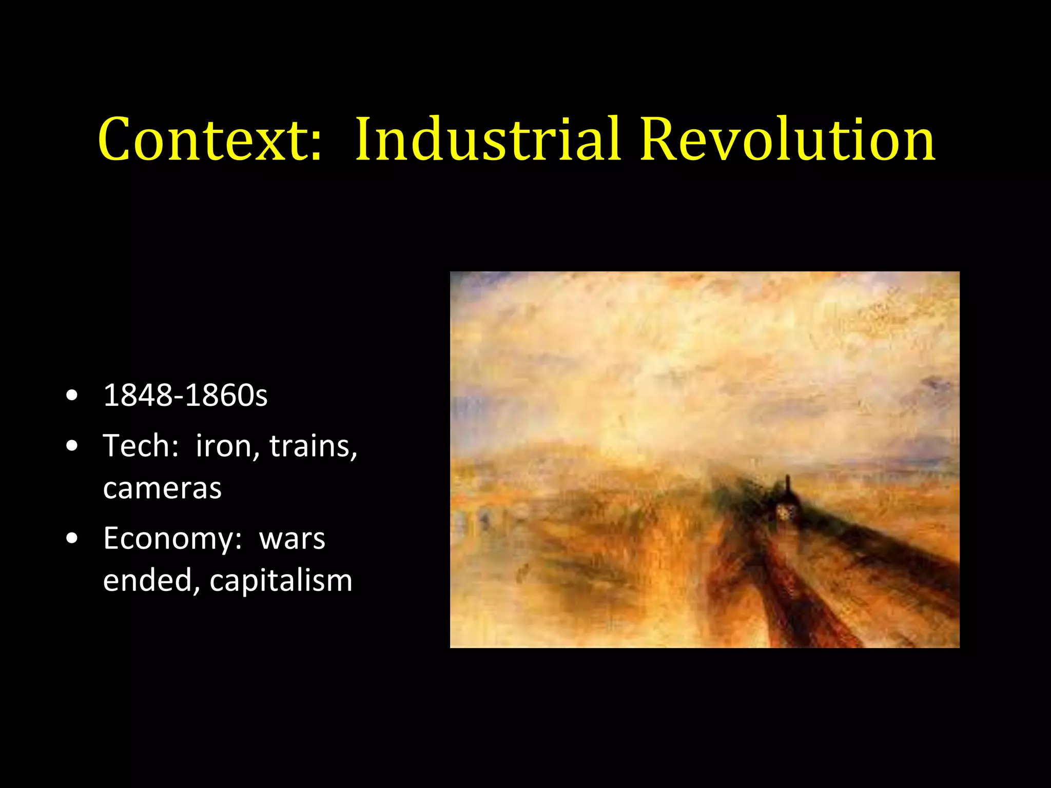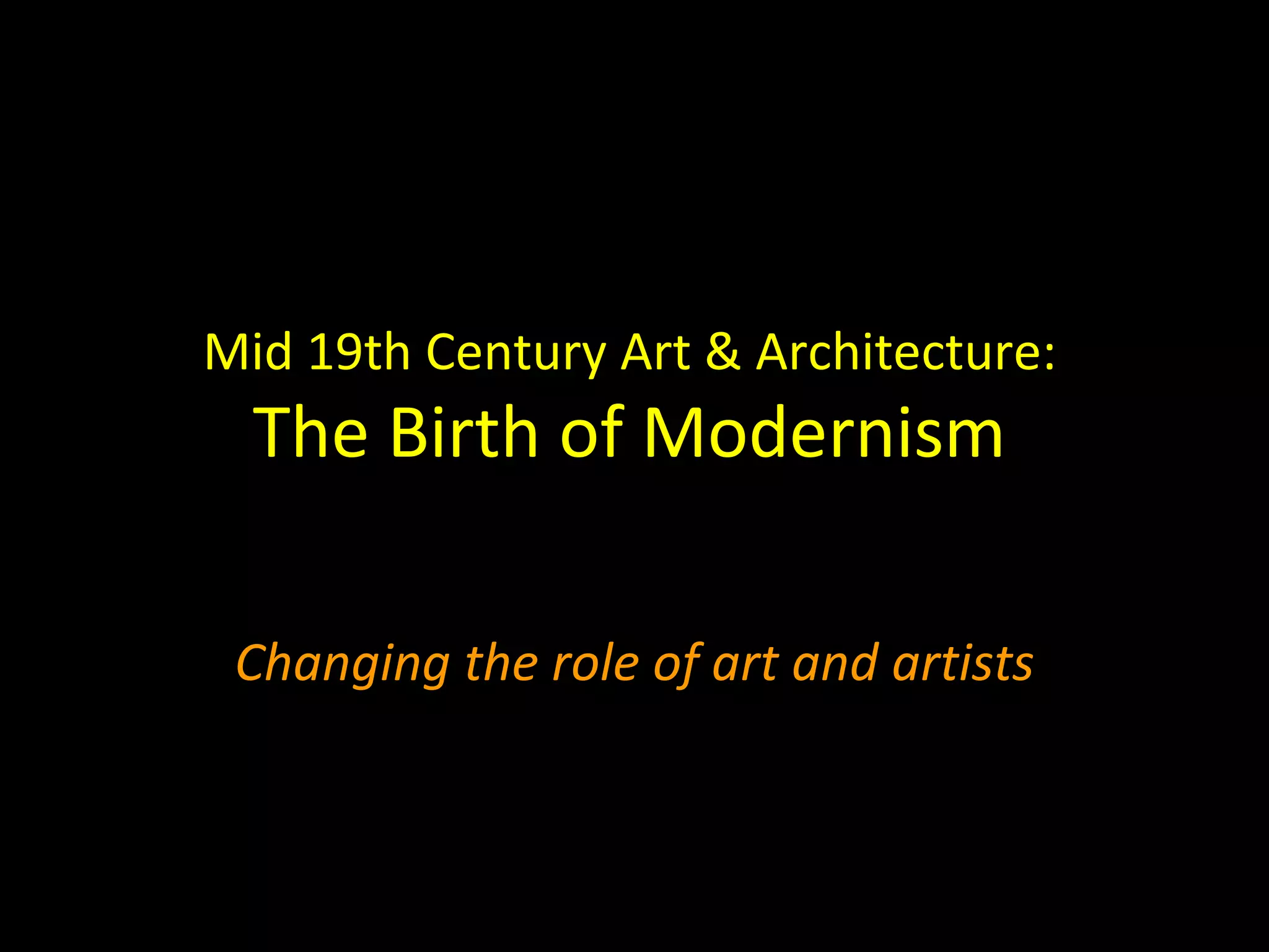 The mid-19th century saw major social, economic, and technological changes with the Industrial Revolution that influenced art and architecture. Artists began focusing on realistic depictions of everyday life, especially the working classes, informed by theories like Marxism, Darwinism, and positivism. This led to the development of realist styles like Courbet's in France and Eakins' in the US. New engineering technologies allowed ambitious projects like the Eiffel Tower and Brooklyn Bridge. The Arts and Crafts movement sought to preserve craftsmanship and dignity of labor. Manet's Luncheon on the Grass was a transition to Impressionism's interest in fleeting reality over academic ideals.