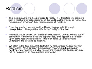 While media aims to represent reality, it inherently involves selection and construction that shapes audience perceptions. Audiences expect some connection to real life but recognize mediation. Assessing a text's realism considers surface details, emotional realism, plot plausibility, and technical codes used. Knowing audiences are aware of mediation and may suspend disbelief for genres like fiction. Reality shows construct narratives through editing, interviews, and conventions to infer a sense of reality.