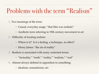 The document discusses the complexities of the term 'realism' in literature and art, highlighting its two primary meanings and its contested nature against idealism and romanticism. It explores challenges in representing reality, noting that representations cannot fully capture what they depict, and introduces concepts like mimesis and verisimilitude. Furthermore, it addresses various societal factors that influence realism, such as race, gender, and class, while considering realism as both a philosophical and technological problem.