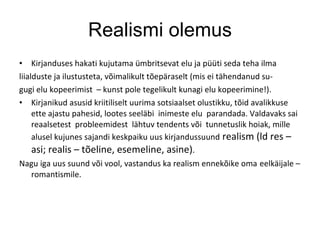 Realismi olemus Kirjanduseshakati kujutama ümbritsevat elu ja püüti seda teha ilma liialduste ja ilustusteta, võimalikult tõepäraselt (mis ei tähendanud su- gugi elu kopeerimist – kunst pole tegelikult kunagi elu kopeerimine!). Kirjanikud asusid kriitiliselt uurima sotsiaalset olustikku, tõid avalikkuse ette ajastu pahesid, lootes seeläbi inimeste elu parandada. Valdavaks sai reaalsetest probleemidest lähtuv tendents või tunnetuslik hoiak, mille alusel kujunes sajandi keskpaiku uus kirjandussuund realism (ld res – asi; realis – tõeline, esemeline, asine) . Nagu iga uus suund või vool, vastandus ka realism ennekõike oma eelkäijale – romantismile.