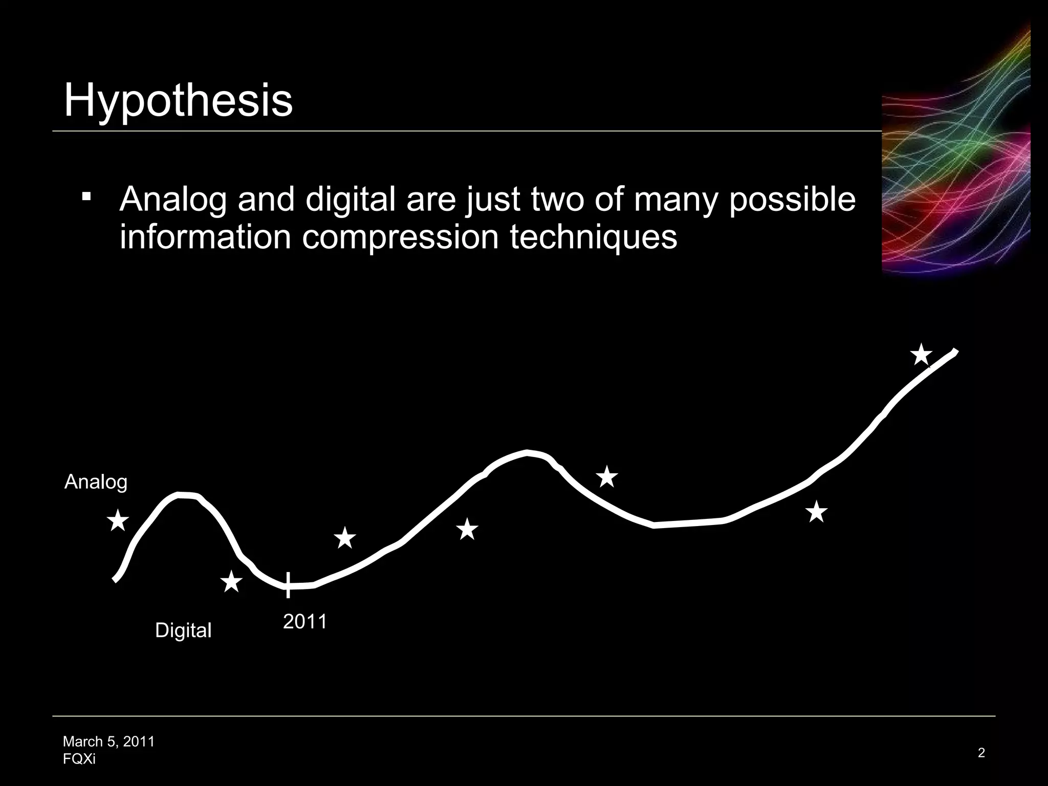 ![Future of information compression March 5, 2011 FQXi Modulate all baryonic matter Analog Digital 2011 Modulate: Strong force Weak force Gravity [muon?] Modulate: Dark matter Dark energy Modulate: Time ICE-3](https://image.slidesharecdn.com/fqxi-110307140057-phpapp01/75/Reality-analog-digital-or-information-compression-continuum-8-2048.jpg)