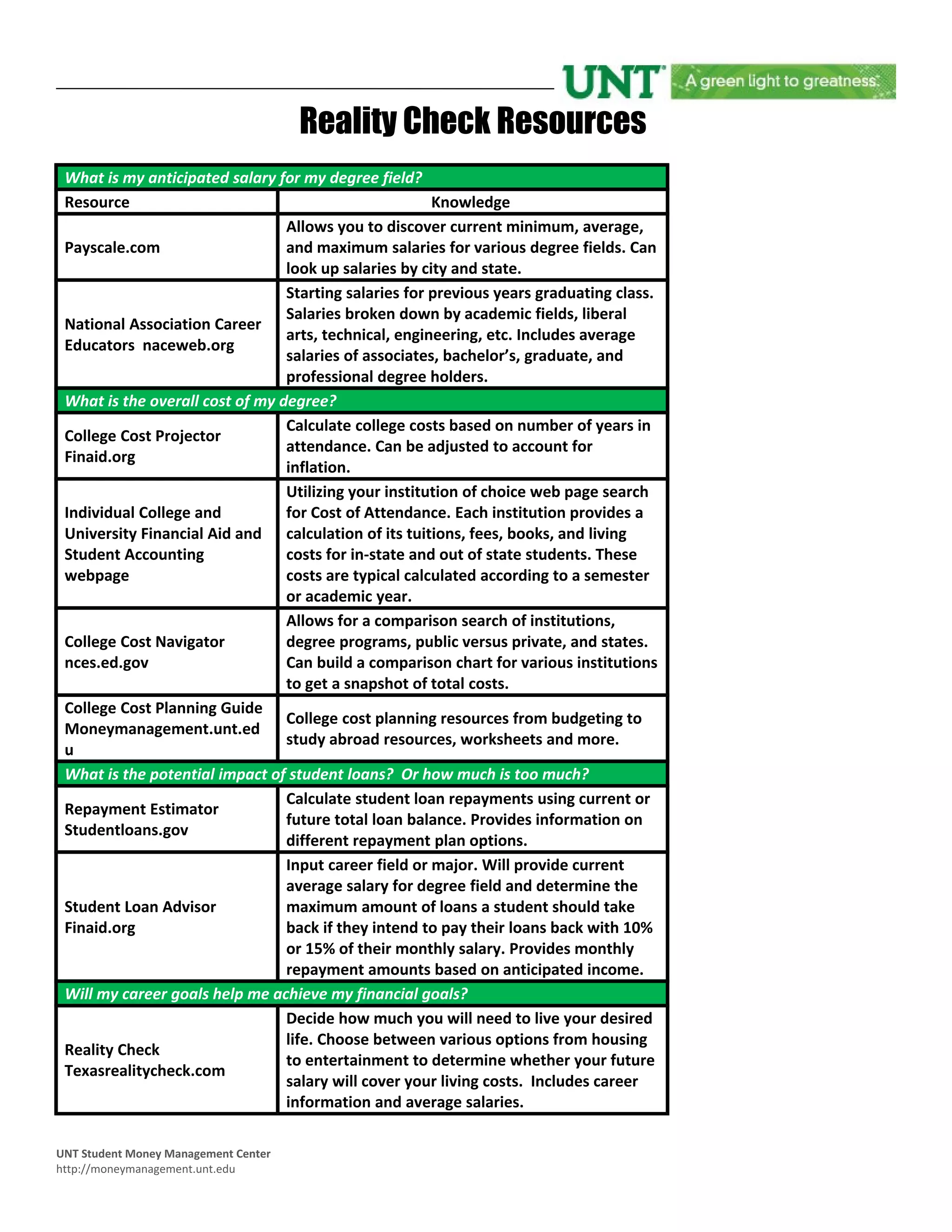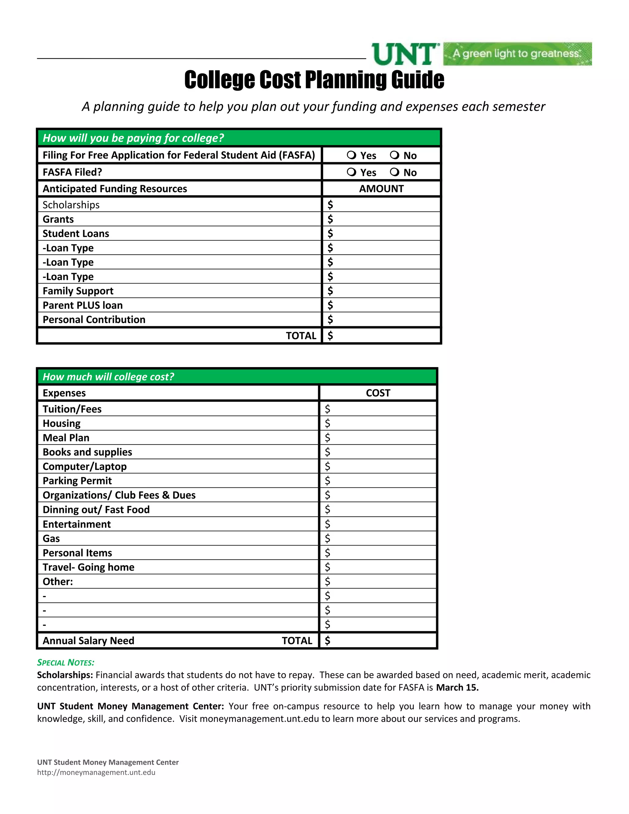 The document is a college cost planning guide that provides information and worksheets for students to estimate their funding sources, expenses, and overall costs of attending college. It includes sections to track anticipated funding from scholarships, grants, loans, family support and personal contributions. Expenses sections include costs for tuition, housing, meals, books and various living expenses. It also provides notes on scholarships and information on the UNT Student Money Management Center as a free resource for students to learn money management skills.