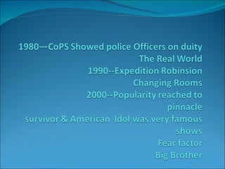 The document discusses the history and types of reality television shows. It notes that the first radio reality show was Allen Funt's Candid Camera and the first TV reality show was a PBS series in the 1970s. Reality shows are categorized as documentary style, elimination/game shows, fear centric, sports, dating based competition, self-improvement/makeover, or renovation shows. The document also examines the advantages and disadvantages of reality shows, such as giving talented people a platform but sometimes being unethical or pre-planned.