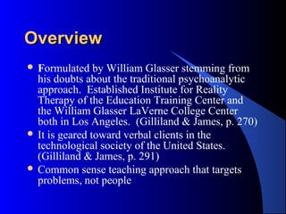 Reality therapy is a cognitive-behavioral approach developed by William Glasser that focuses on taking responsibility for one's actions and meeting needs in constructive ways. The counselor's role is to keep clients focused on the present and developing specific plans to improve behavior. The ultimate goal is for clients to feel better by gaining effective control over their lives and meeting needs without depriving others. Reality therapy uses techniques like confrontation, planning, and evaluating behaviors to help clients develop a success identity based on responsible fulfillment of needs.