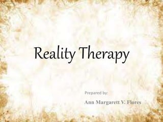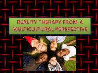 1. Reality therapy is a counseling approach based on choice theory which posits that human behavior is driven by five basic needs and that people have the ability to choose their behaviors.