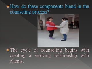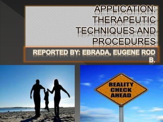 3. Key aspects of reality therapy include keeping therapy focused on the present, emphasizing personal responsibility and choice over past events, avoiding non-constructive techniques like transference, and developing plans that are simple, measurable, and committed to by the client.