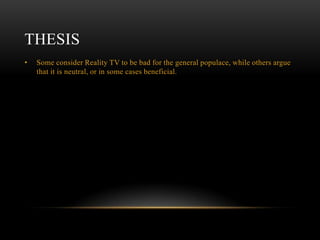 Reality television has evolved significantly since its origins in the 1940s. Some argue that reality TV is beneficial because it can teach life lessons and build cooperation, while others counter that it often relies on racial stereotypes, places unrealistic physical standards, and contains inappropriate crude content that violates the public trust. Ultimately, the essay concludes that reality television has become a permanent fixture of popular culture.