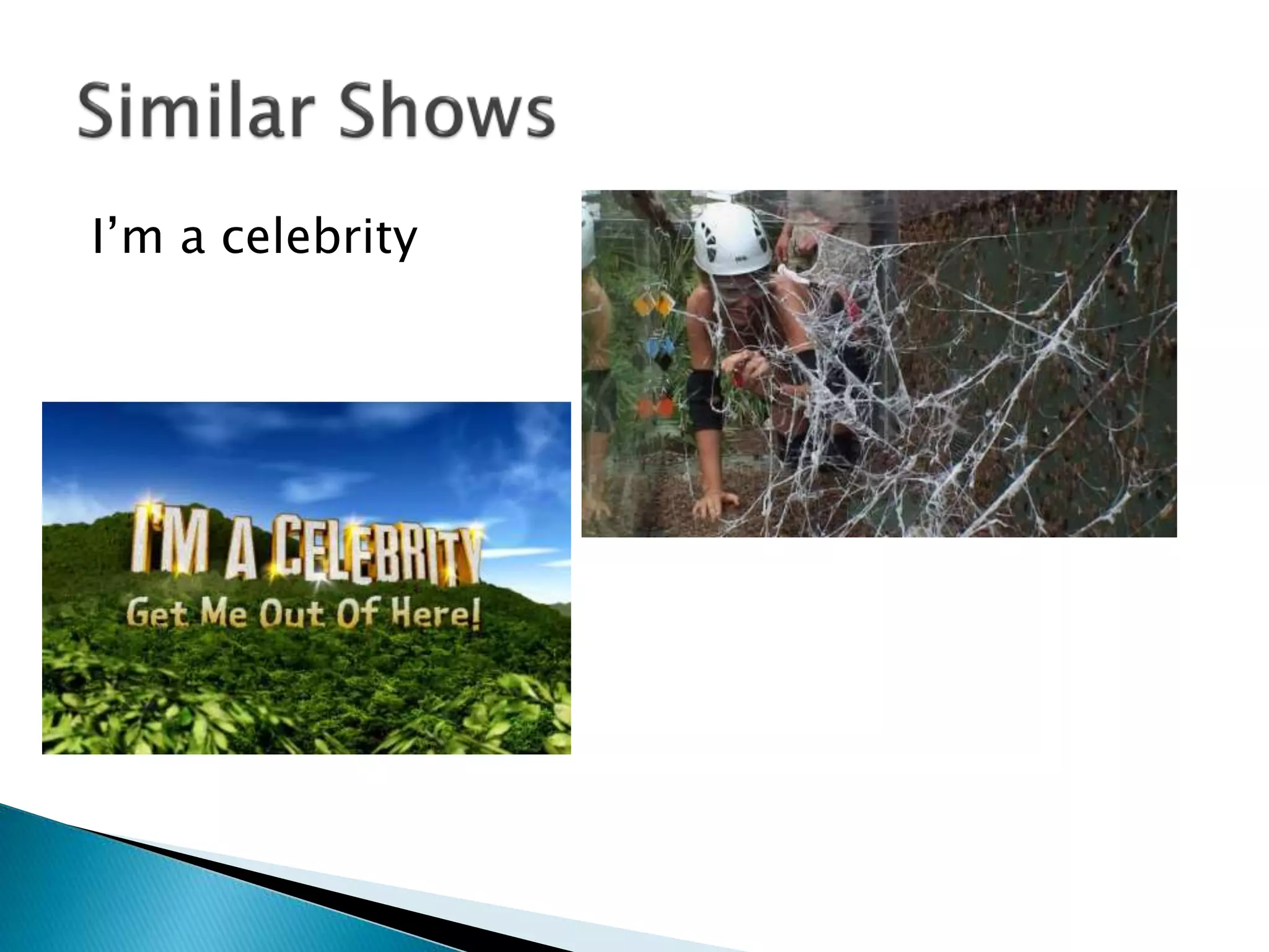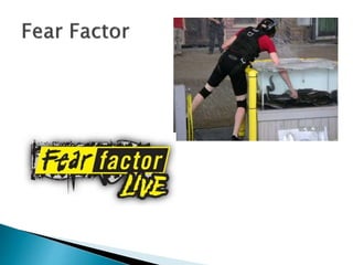I'm a Celebrity...Get Me Out of Here! is a reality show where celebrities live together in a jungle for weeks, with winners being crowned King or Queen. Fear Factor is an American stunt show with contestants completing three rounds of challenges, and the winner of the final challenge receives $50,000. Wipeout also features contestants completing an obstacle course.