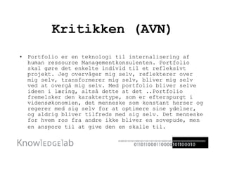 Kritikken (AVN) Portfolioer en teknologi til internalisering af human ressource Managementkonsulenten. Portfolio skal gøre det enkelte individ til et refleksivt projekt. Jeg overvåger mig selv, reflekterer over mig selv, transformerer mig selv, bliver mig selv ved at overgå mig selv. Med portfolio bliver selve ideen i læring, altså dette at det ..Portfolio fremelsker den karaktertype, som er efterspurgt i vidensøkonomien, det menneske som konstant herser og regerer med sig selv for at optimere sine ydelser, og aldrig bliver tilfreds med sig selv. Det menneske for hvem ros fra andre ikke bliver en sovepude, men en anspore til at give den en skalle til.