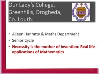 This document summarizes the key insights and lessons learned from a maths department's lesson study process. It discusses three separate lesson plans: 1) using geometry to solve a real-world problem of designing cheerleader skirts, 2) hands-on scaling of crocheted owls to demonstrate dimensional concepts, and 3) a video explaining derivatives and tangents to curves. Data collected showed that students were highly motivated when lessons had real-life applications and that peer-to-peer learning and discussion aided understanding. The process helped teachers strengthen their conceptual grasp of topics and encouraged more student questioning.