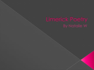 The document discusses the history and structure of limericks. It notes that limericks gained popularity in the 1800s with Edward Lear's Book of Nonsense. A typical limerick follows an AABBA rhyme scheme, with the first, second and last lines rhyming and having the same number of syllables, and the third and fourth lines rhyming and also having the same number of syllables. Examples of limericks are provided to illustrate their structure and use of nonsensical themes.