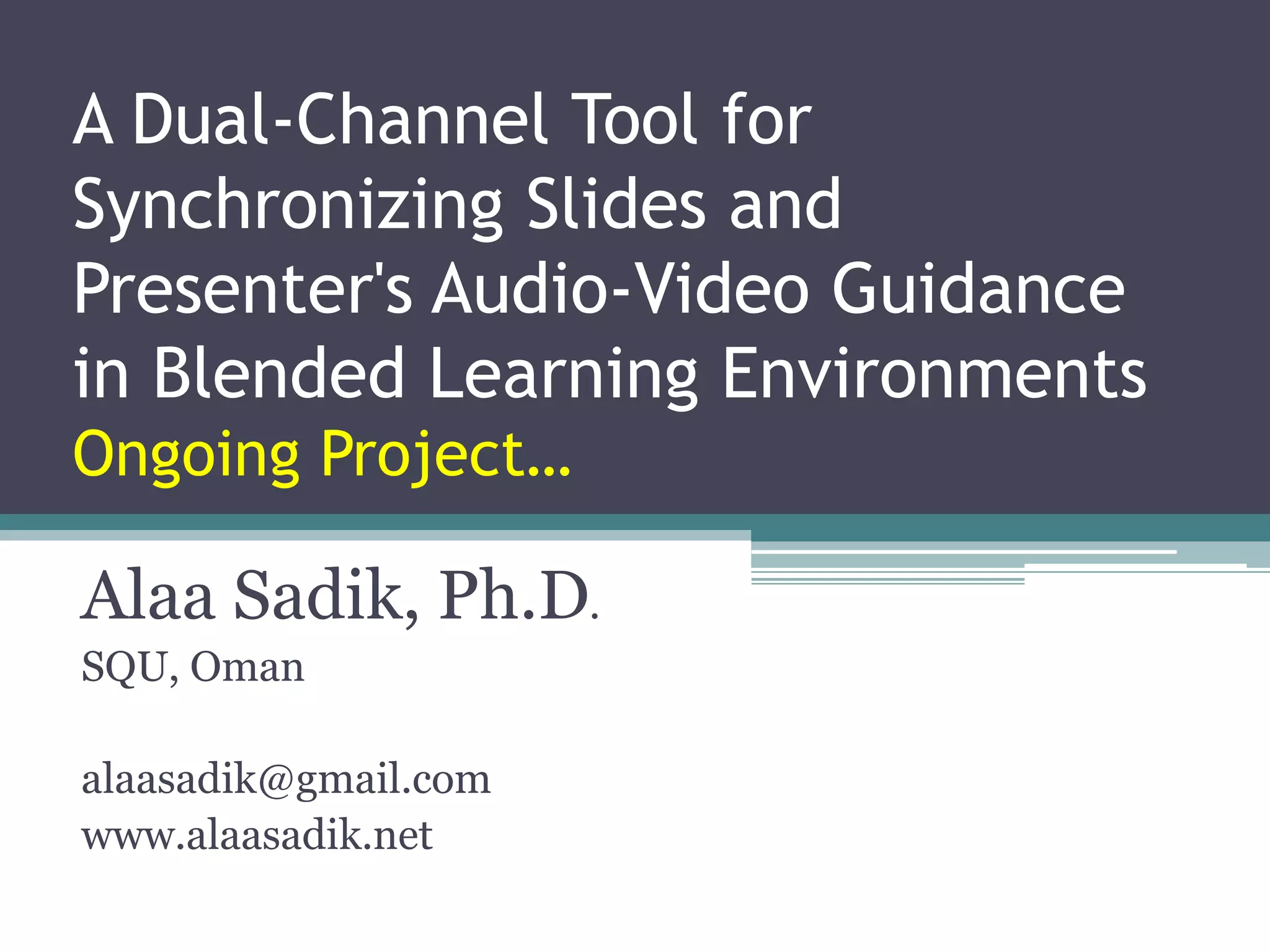 The document discusses a dual-channel tool aimed at synchronizing slides with a presenter’s audio-visual guidance to enhance blended learning environments. It highlights the limitations of using Microsoft PowerPoint alone for effective teaching and proposes software that facilitates recording and presenting lectures online. The design focuses on user-friendly principles that align with human cognitive processing, aiming to improve student engagement and reduce cognitive load.