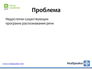 Документ описывает стартап 'Реалспикер Лаб', который разрабатывает видео-плагин для улучшения точности программ распознавания речи, начиная с декабря 2011 года. Решение включает параллельный анализ аудио и видео потоков, что позволяет увеличить точность распознавания более чем на 20%. Команда планирует запустить продукт с моделью 'try&buy' и рассматривает возможность лицензирования технологии.