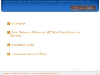 The document describes a technique called Bézier Trajectory Deformation (BTD) for modifying a Bézier curve trajectory to avoid obstacles while navigating a mobile robot. BTD uses potential field methods to generate a field of vectors, which are then used to perturb the control points of the Bézier curve and deform the trajectory away from obstacles. The deformation is formulated as an optimization problem to minimize changes to the trajectory shape. Simulations show BTD can efficiently compute modified trajectories in real-time by solving a linear system of equations. The technique helps enable reactive obstacle avoidance for mobile robots using smooth parametric curve trajectories.