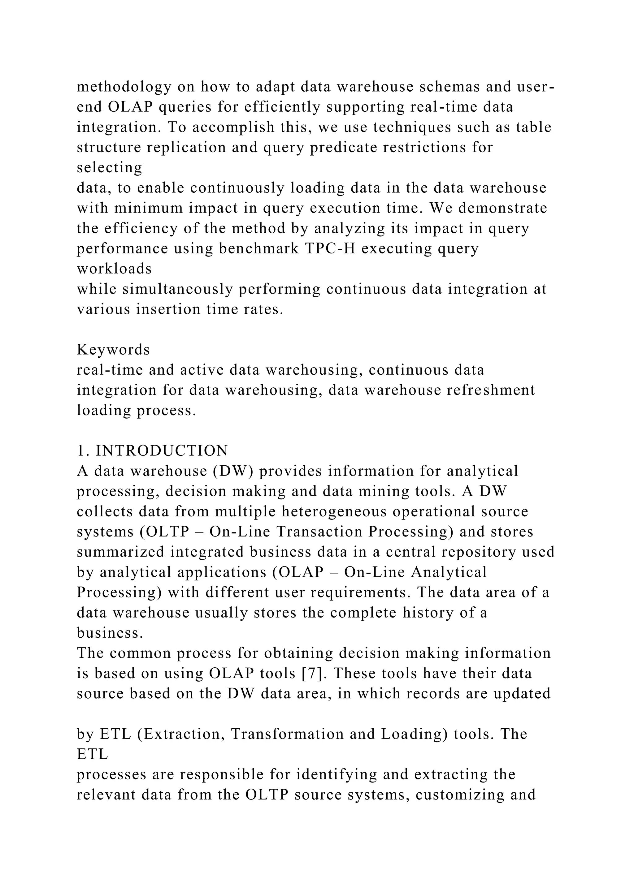 This paper presents a methodology for adapting data warehouse schemas and OLAP queries to support real-time data integration, addressing the limitations of traditional data warehouses which update data periodically. The proposed system allows for continuous integration of operational data into the data warehouse while minimizing performance impacts on OLAP queries. The methodology emphasizes the importance of maintaining data freshness and reducing update time windows to enhance user access to current information for decision-making processes.