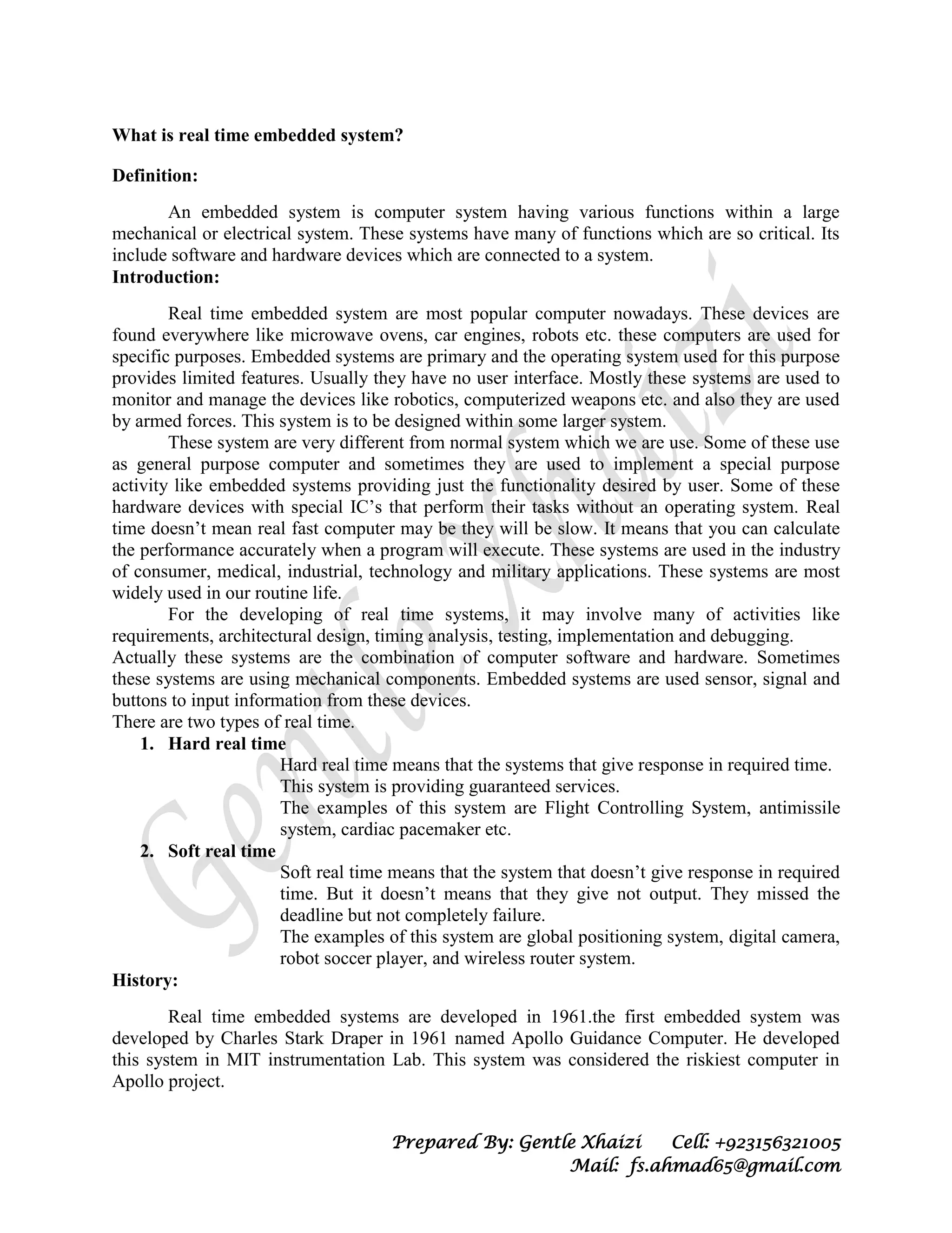 This document discusses real time embedded systems. It defines embedded systems as computer systems with specific functions within larger mechanical or electrical systems. Real time embedded systems are found everywhere and must provide responses in guaranteed time frames, like flight control and medical systems. They have limited operating systems and no user interface. The document discusses the history of embedded systems, how they interact with inputs and outputs, their uses in daily life, advantages like low cost and reliability, and disadvantages like difficult upgrades. It provides examples of embedded system applications in various fields like vehicles, traffic control, manufacturing, and multimedia.