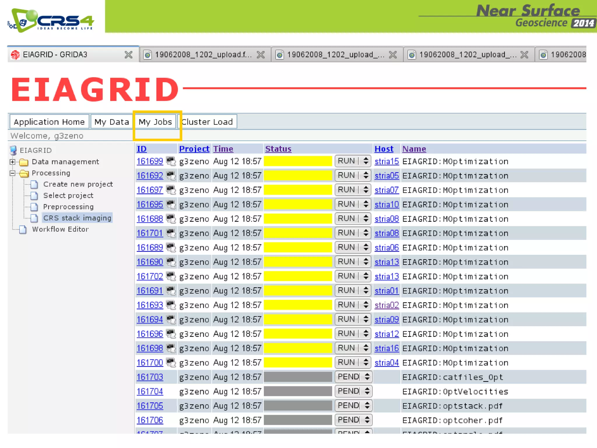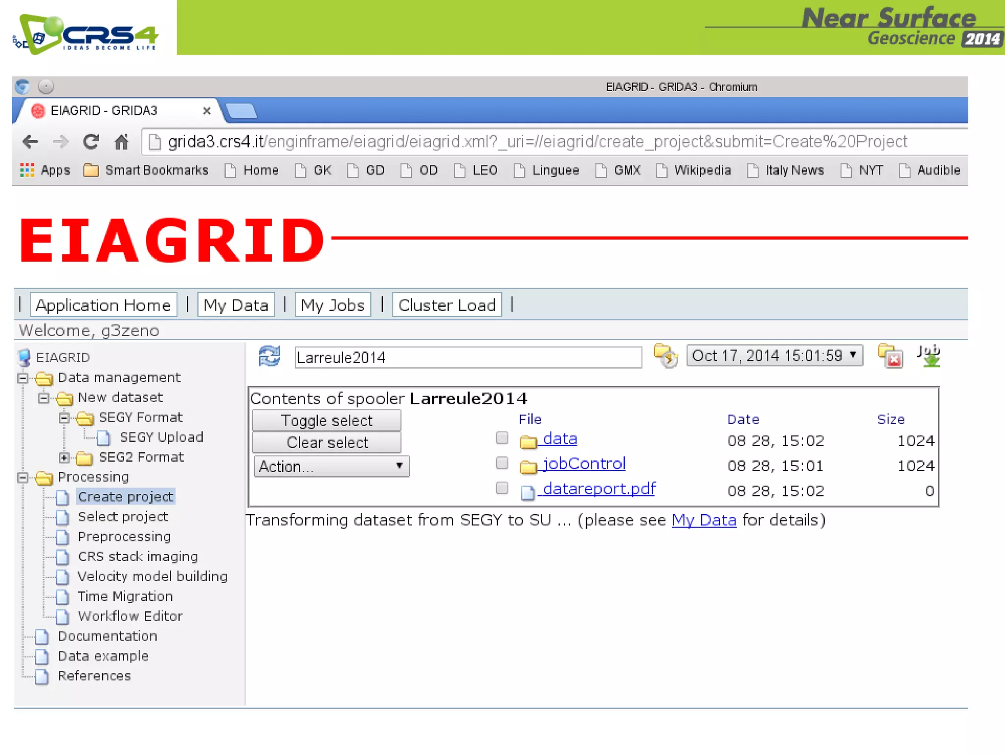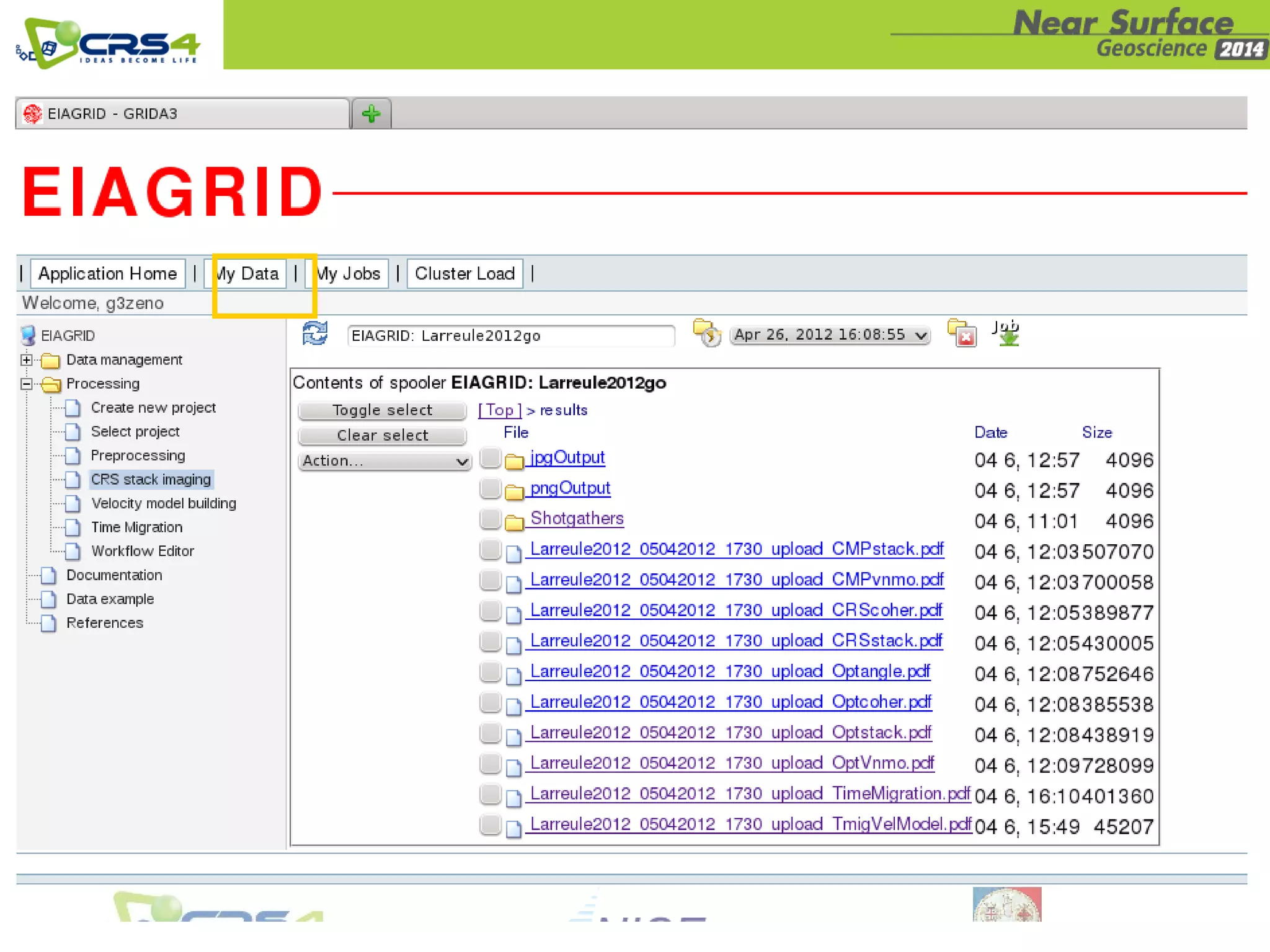 This document describes using a cloud computing portal for real-time and full-precision common reflection surface (CRS) imaging of ground penetrating radar and shallow seismic data. It presents examples of using the portal for real-time multi-offset GPR imaging and full-precision SH-wave imaging. The portal allows 3D parameter searches for high resolution CRS stacking or 3D line searches for rapid real-time imaging directly in the field. Full precision CRS imaging provides higher resolution and more stable velocities than conventional NMO methods for low fold, noisy, or laterally varying data. The cloud computing approach reduces hardware requirements and facilitates the use of data-driven imaging methods for near-surface applications.