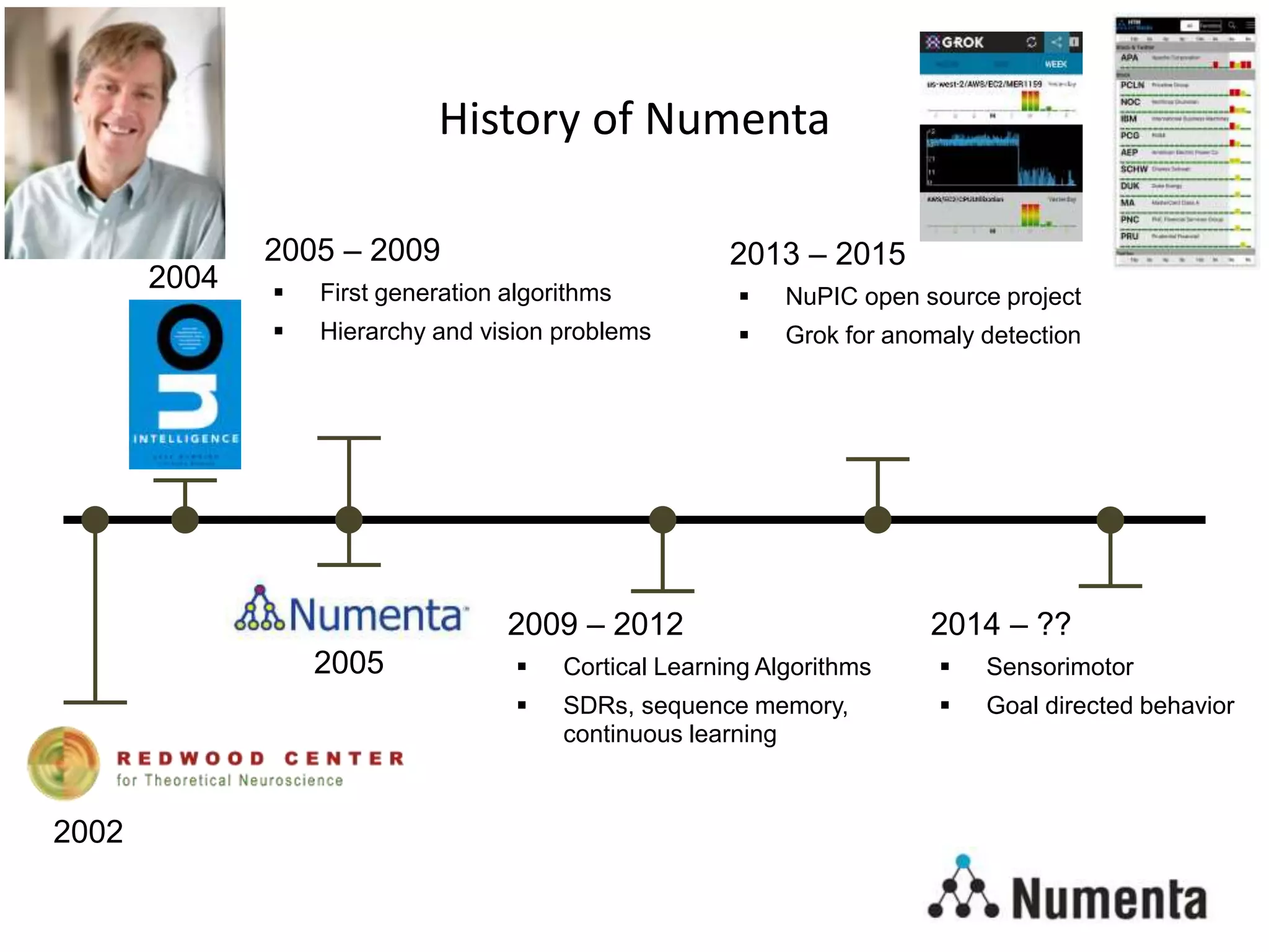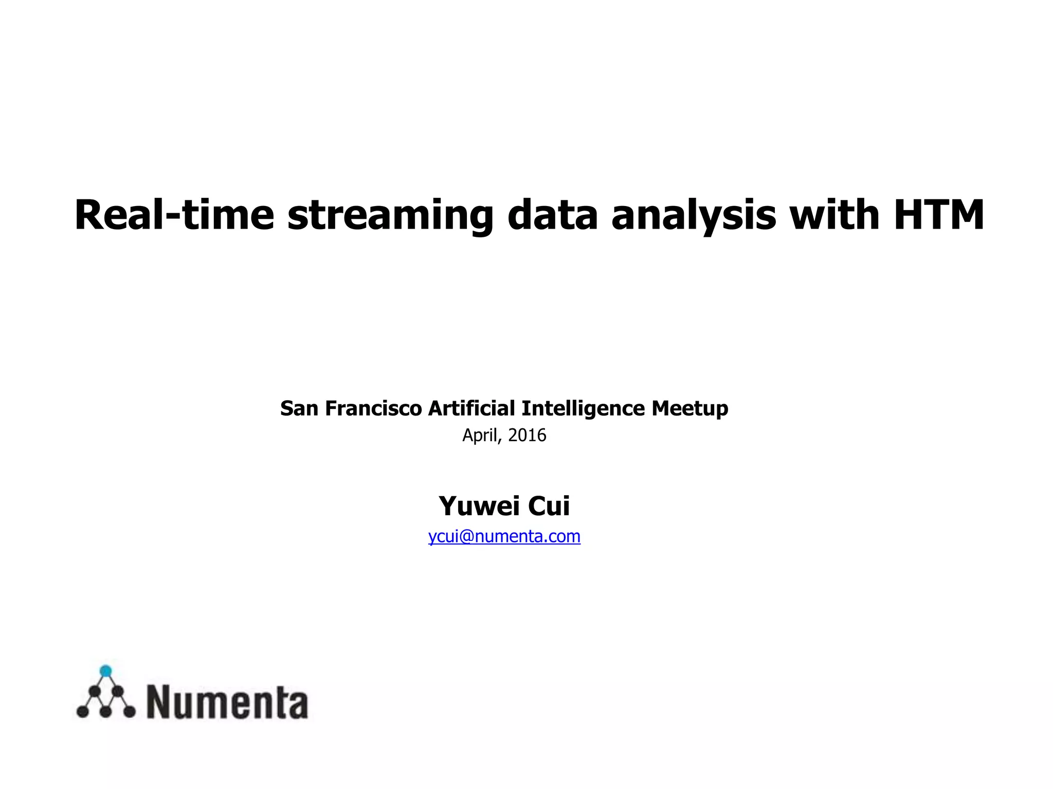 Yuwei Cui from Numenta presented on real-time streaming data analysis using Hierarchical Temporal Memory (HTM). HTM is based on principles of the neocortex and allows for online learning of high-order sequences from streaming data. HTM can make multiple predictions simultaneously and is fault tolerant. It has been applied successfully to problems like anomaly detection in data center servers and geospatial tracking data. Numenta is working to further understand the neocortex and create more biologically accurate models to continue advancing machine intelligence.
