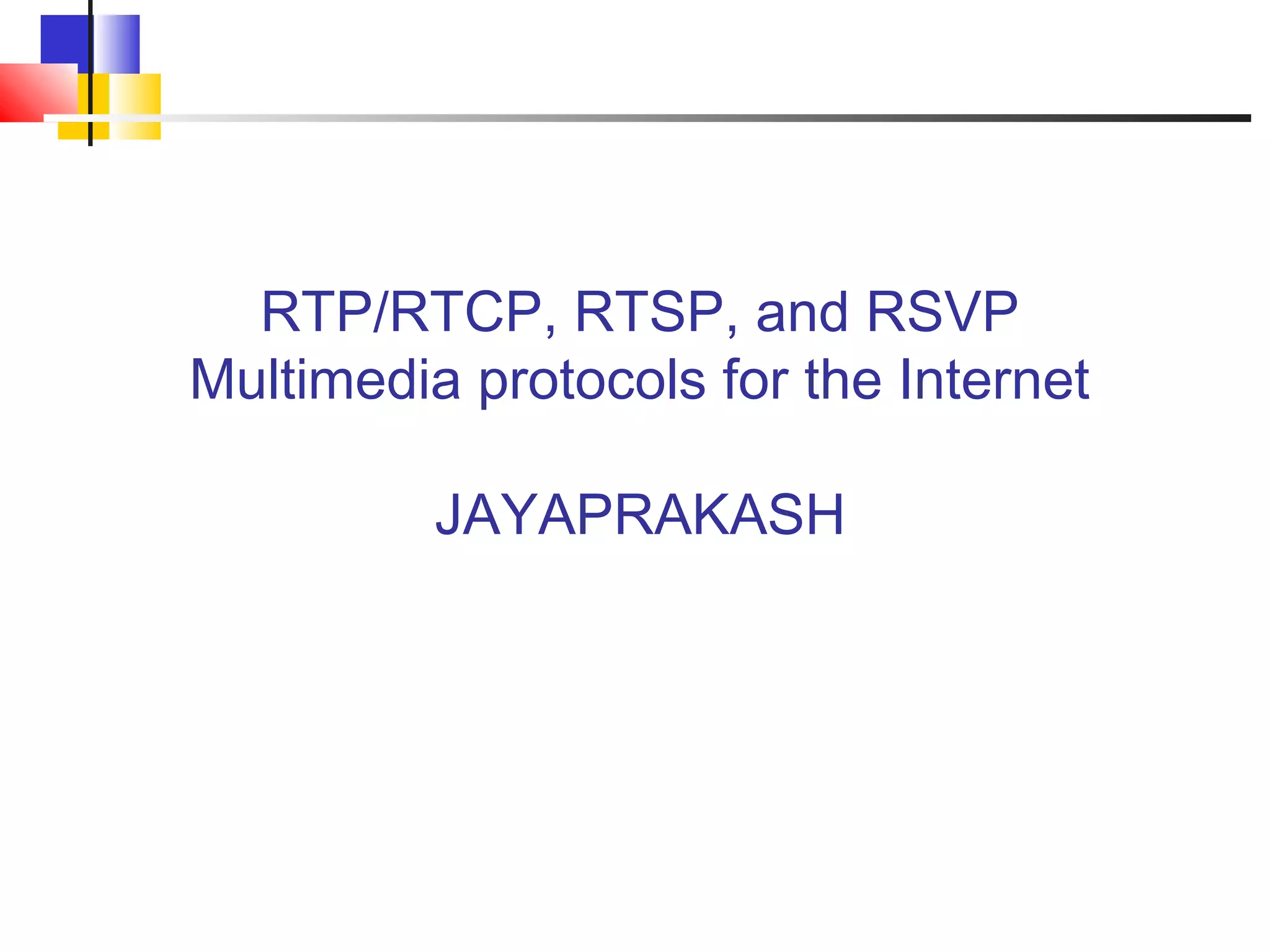 The document provides an overview of multimedia protocols including RTP/RTCP, RTSP, and RSVP for the internet. It discusses their roles in real-time applications, session description, control, media transport, and resource reservation, emphasizing the flexibility and design goals of each protocol. Additionally, it elaborates on the functionality of RSVP in managing quality of service through resource reservation along data paths.