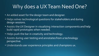 The document discusses the collaborative design process, emphasizing the need for open-mindedness and teamwork despite potential conflicts and frustrations among stakeholders. It highlights the importance of rapid iterative testing and user validation to improve and solidify design concepts. The text also mentions that a strong understanding of usability principles is essential for UX developers.