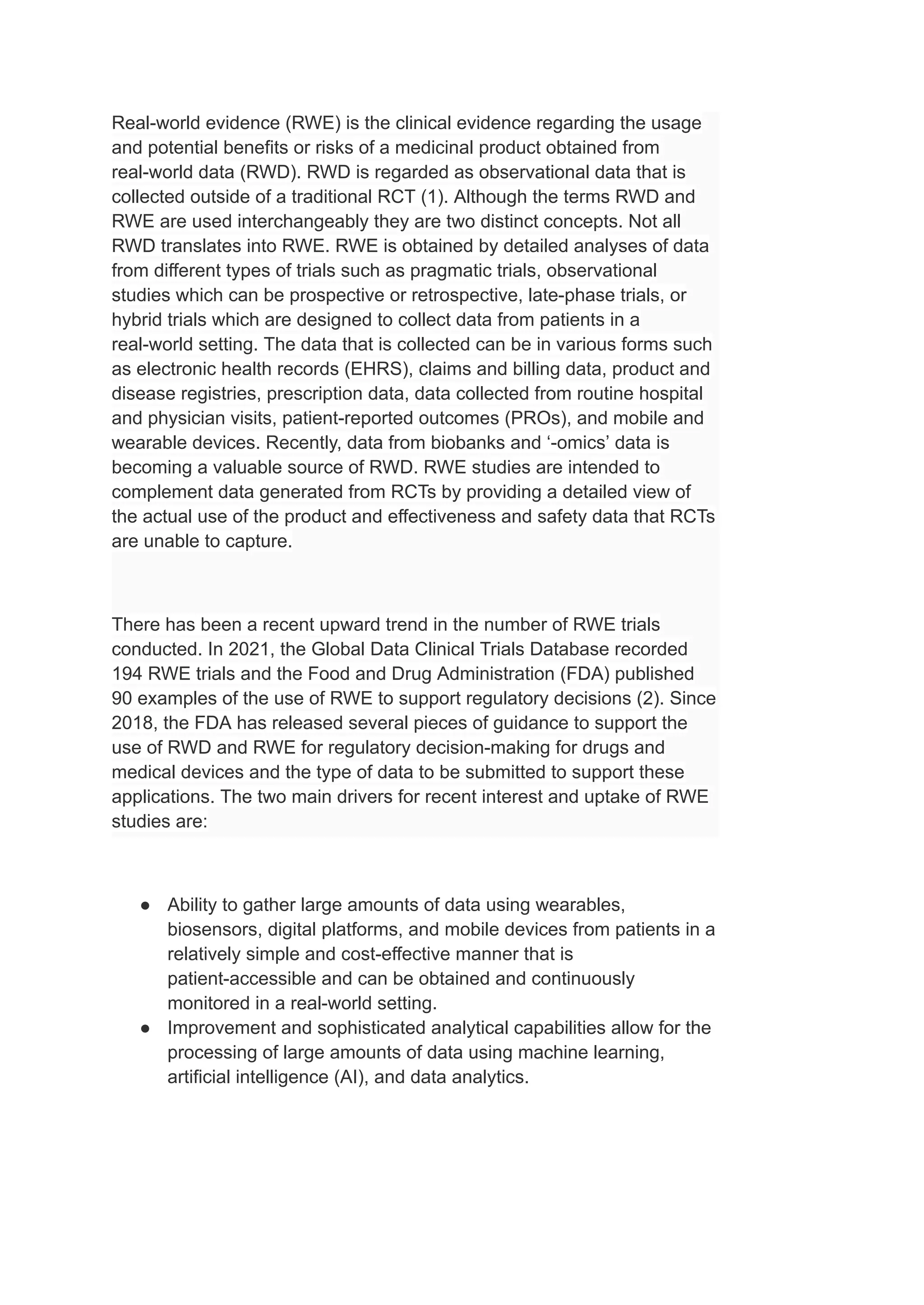 Real-world evidence (RWE) studies are increasingly utilized to complement randomized controlled trials (RCTs) by providing insights into the safety and efficacy of treatments in broader patient populations. RWE is derived from various sources such as electronic health records and patient registries, and informs decisions throughout the product lifecycle, including regulatory approvals and cost analyses. However, the reliability of RWE depends on a rigorous data collection strategy that addresses issues of data quality, representation, and appropriateness for specific research questions.