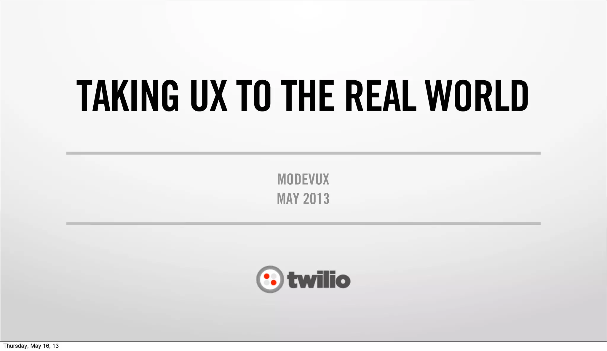 The document discusses how user interfaces are breaking through into the real world. It introduces Twilio, a company that makes it easy to integrate voice, VoIP, and text messaging into business processes. Twilio allows for immediate interactions with customers via SMS with high open rates. It also enables connecting humans to humans by letting people call businesses directly. Additionally, Twilio can enhance user security by using mobile phones for two-factor authentication. The overall message is that software like Twilio's is using technologies like voice and SMS to create interactions in the real world.