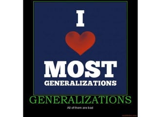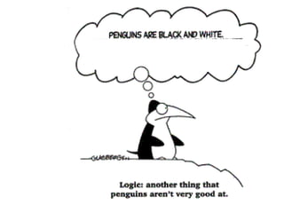 The document discusses different types of logic, including deductive and inductive reasoning. It notes that deductive reasoning is more certain but less informative than inductive reasoning. It also discusses what distinguishes good generalizations from bad ones, including considering number and variety of examples, exceptions, coherence, and subject area. The document describes how logic can help get closer to truth when premises are true and arguments are valid, but gives examples of when conclusions could be tentatively accepted. It also discusses common fallacies in reasoning such as post hoc, ad hominem, circular reasoning, equivocation, and false dilemmas.