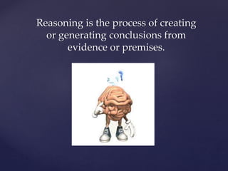 Reasoning is the process of creating conclusions from evidence or premises. There are two main types of reasoning: inductive and deductive. Inductive reasoning uses specific examples to derive general conclusions, while deductive reasoning moves from general statements to a certain conclusion. Within inductive reasoning there are five methods: reasoning by example, cause, sign, comparison, and authority. Each method has specific tests to determine its validity. Fallacies are errors in reasoning and common fallacies include false dilemmas, appeals to emotion, non-sequiturs, slippery slopes, and ad hominem attacks. While logic is important for persuasion, desires and needs of receivers also influence what conclusions they will accept.
