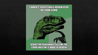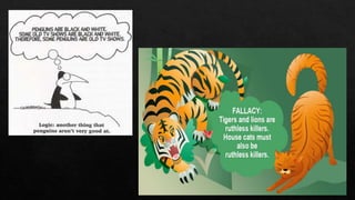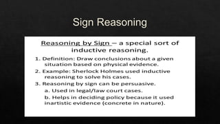 The document discusses various types of reasoning, including deductive, inductive, analogical, abductive, and fallacious reasoning, and suggests that reasoning ability develops from infancy influenced by cognitive factors like memory and executive functions. It highlights the importance of understanding different reasoning methods for effective argumentation and decision-making, including how flawed reasoning can arise from formal or informal fallacies. Additionally, it outlines mental heuristics that affect reasoning processes, emphasizing the need for critical thinking and engagement in activities to enhance reasoning skills.