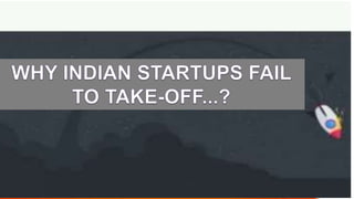 The document discusses startups in India and reasons for startup failures. It defines a startup and provides an introduction to the startup scenario in India. It then discusses major reasons for startups failing to take off, including building the wrong product, lack of funding, not having a unique value proposition, and more. Finally, it concludes that startups can play an important role in economic development but that the government and institutions need to better support them.