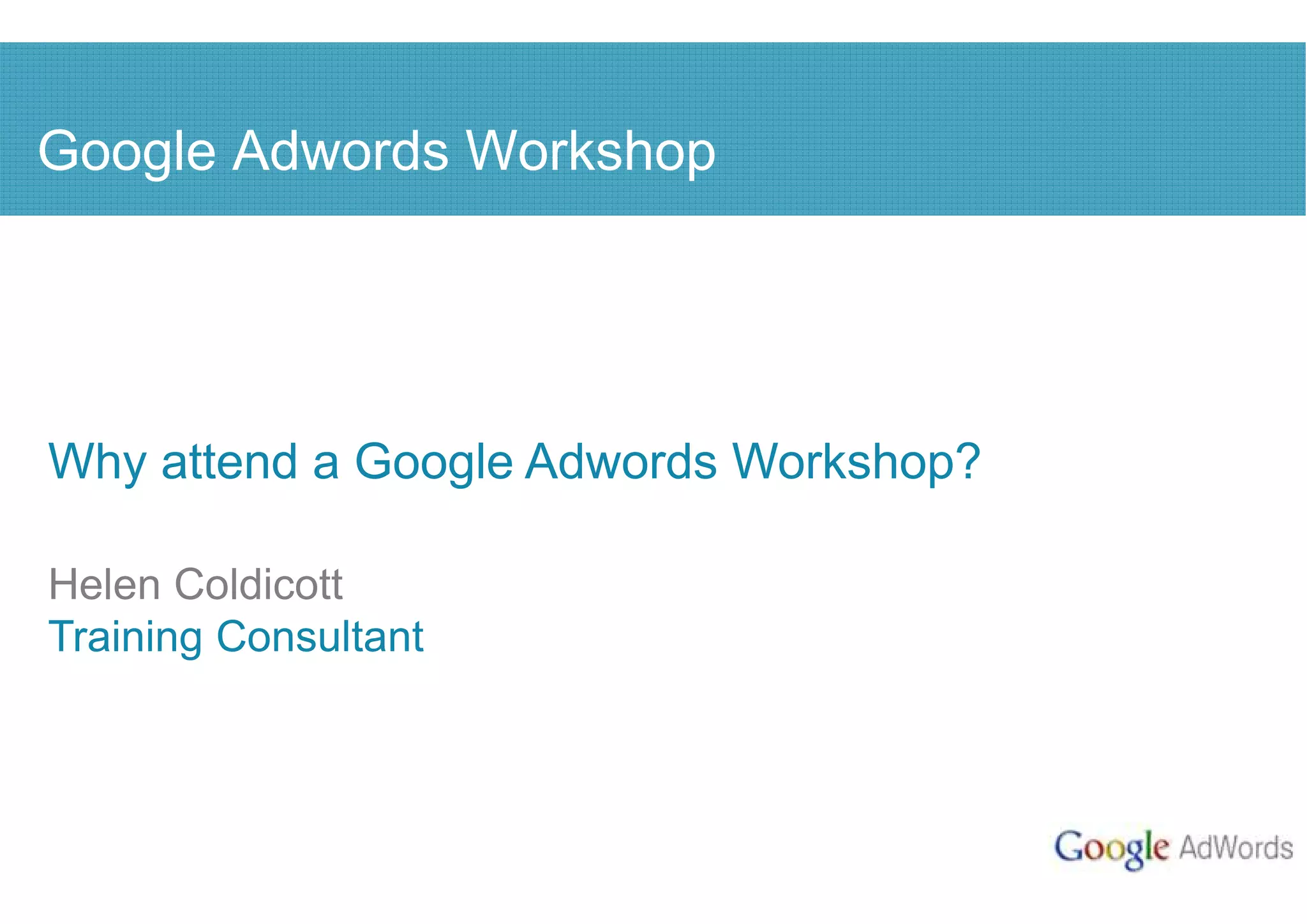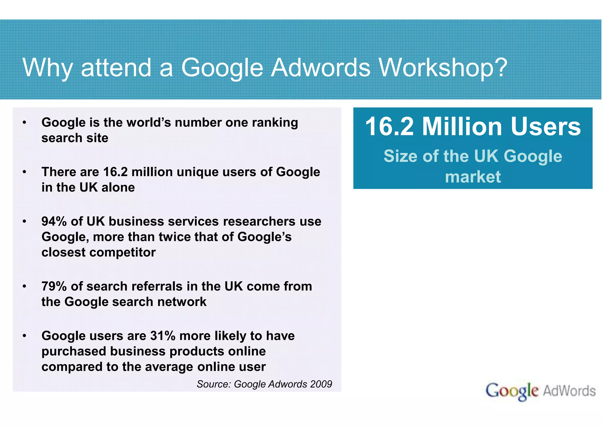 The document summarizes the benefits of attending a Google Adwords Workshop. Key points include: Google has over 16 million UK users and is the top search engine; the workshop teaches attendees how to use Google Adwords effectively to drive more visitors and leads to their website; attendees will learn about account setup, keywords, ad text, and tracking performance metrics. The workshop also allows attendees to work on and improve their own Adwords account. Previous delegates provided positive feedback about the workshop.