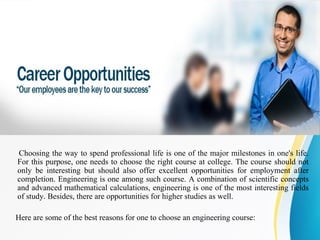 The document outlines the benefits of choosing an engineering course, highlighting its career flexibility, high-paying job opportunities, and interesting work involved in various engineering fields. It emphasizes the importance of selecting a suitable college course for professional life and how engineering combines scientific concepts with mathematics. Additionally, it provides contact information for Shri Krishan Institute of Engineering & Technology in Kurukshetra.