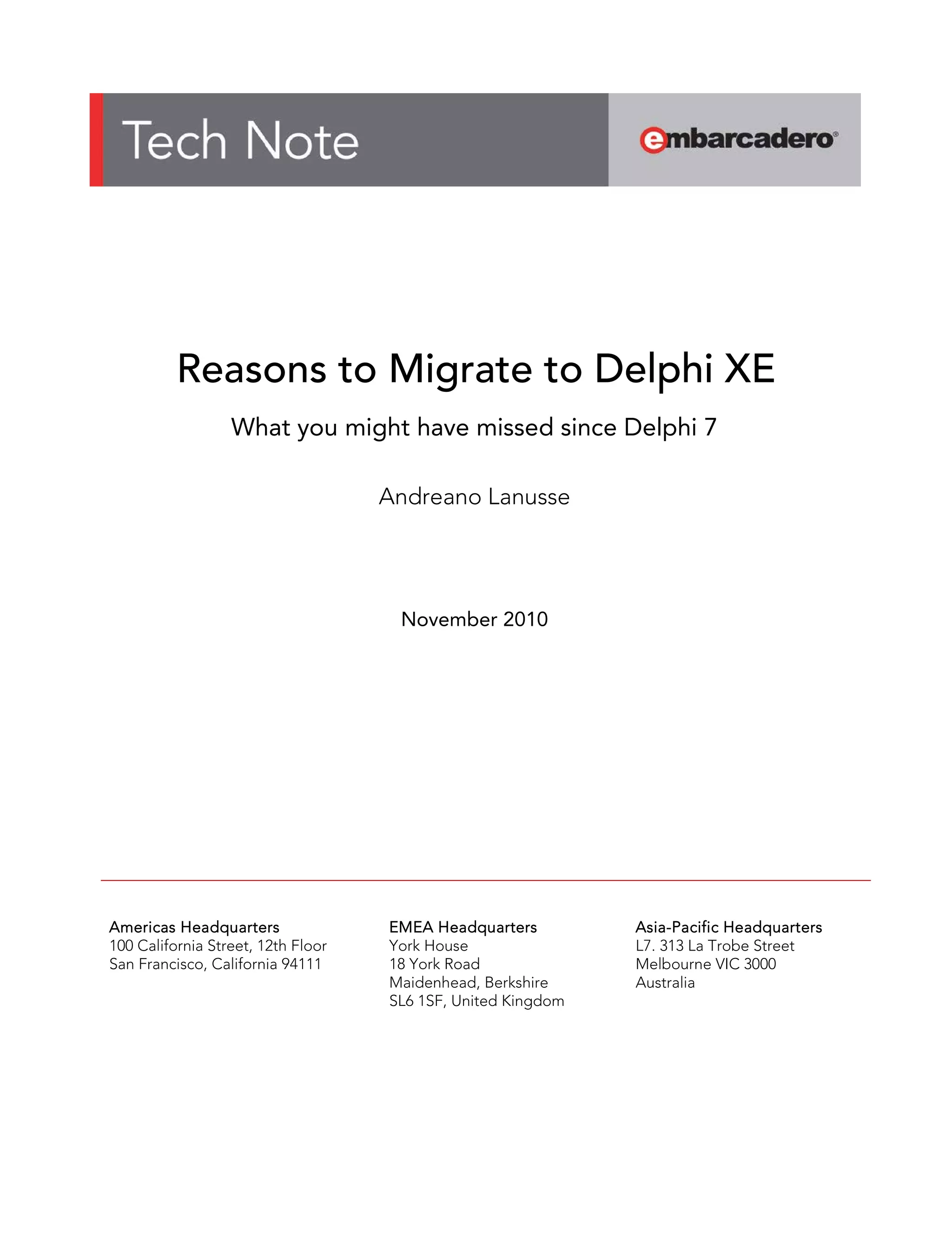 The document discusses the advantages of migrating to Delphi XE from earlier versions, highlighting numerous new features and enhancements introduced since Delphi 7. It presents a comprehensive list of improvements in areas such as the IDE, project management, language features, and developer productivity tools. Ultimately, the paper aims to provide developers with compelling reasons to upgrade to optimize application quality and performance.