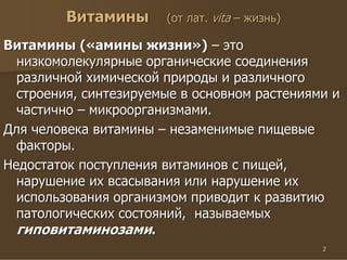 Документ описывает основные питательные вещества пищи, включая виды витаминов и их роль для человека. Указывается на важность витаминов, их классификацию по растворимости и суточные потребности, а также последствия недостатка витаминов. Приведены конкретные примеры витаминов, их дефицитов и связанных заболеваний.