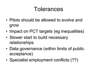 1. The document outlines 10 principles for integrated care organizations (ICOs) and discusses various considerations for establishing ICO pilots, including allowing pilots time to evolve, managing consultant and acute trust relationships, and developing interorganizational relationships between groups.