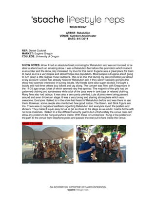 The document summarizes a concert promotion for the band Rebelution held in Eugene, Oregon. It describes the promoter's positive experience at the show and promoting it in various venues prior. It notes Eugene has a liberal population receptive to reggae music. Accounts targeted for promotion included the University of Oregon campus, local record store, smoke shops, cafe and retail store. Online promotion occurred via the promoter's Instagram, Twitter and posting photos from the show. The concert drew a party-oriented crowd of Oregonians aged 17-35 dressed casually, many with tattoos. Feedback on Rebelution and other bands was positive.