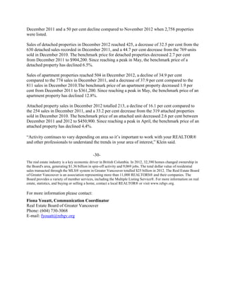 Home sales in Greater Vancouver declined 22.7% in 2012 compared to 2011, while home listings declined slightly by 2%. Prices held relatively firm, declining modestly by 2.3% over the year. Activity was below average as both buyers and sellers remained hesitant in the market throughout most of 2012. By December 2012, home sales had fallen 31.1% compared to the previous December, with declining sales across detached, attached and apartment properties, while benchmark home prices fell slightly across all property types.