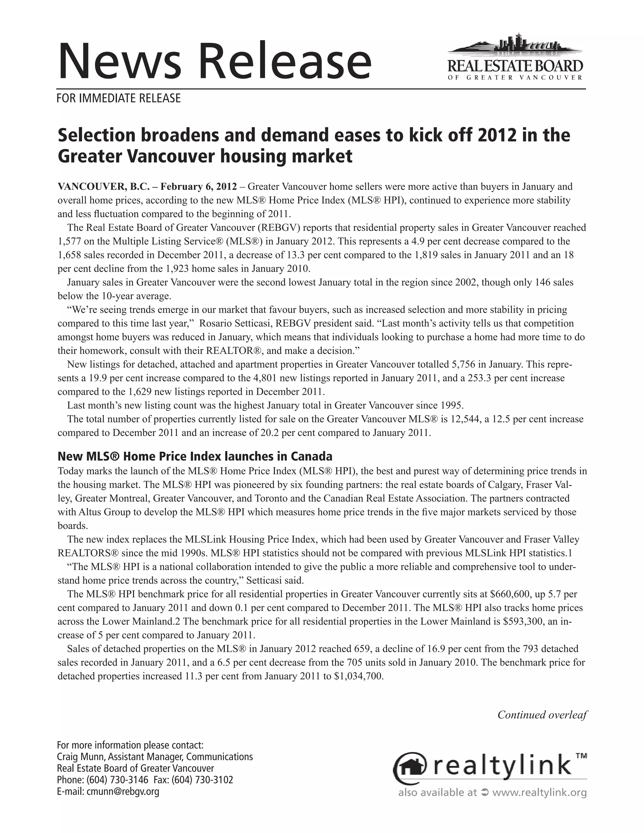 - Home sales in Greater Vancouver decreased in January 2012 compared to December 2011 and January 2011, while new home listings increased significantly.