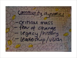 The document outlines a 4 part story about addressing usability issues in a software project. It describes problems arising, a turning point when fixes were required, and the launch of the D7UX approach. The D7UX used open collaboration, skill sharing and test crowdsourcing to engage the community, share work on sites like Flickr and YouTube, and provide communication structures to improve the project through a transparent, participatory process. The outcome is uncertain but could be a "game changer" with community action.