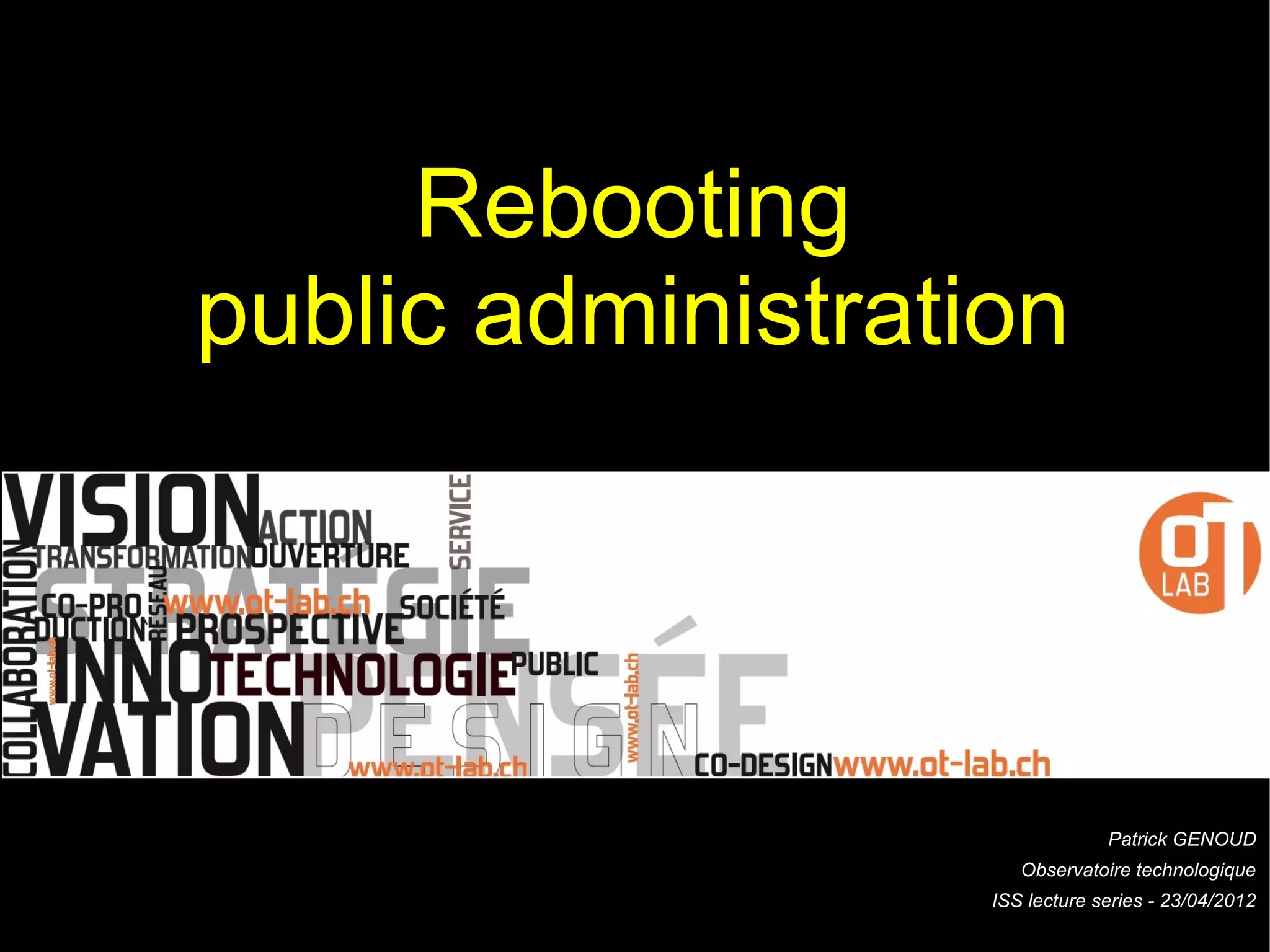 This document discusses rebooting and transforming public administration through new approaches and technologies. It argues that public administration needs to become more citizen-oriented, open, collaborative, global, multidisciplinary, and focused on concrete experimentation and innovation. However, the reality is that public administration tends to be risk-averse and focused on short-term goals. Technologies provide opportunities but also require new skills and methods like co-creation, service design thinking, and communication to drive transformation. Case studies and lessons learned emphasize fueling experimentation, finding sponsors, co-creating with citizens, and adopting an iterative approach.