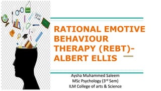 Albert Ellis developed Rational Emotive Behavior Therapy (REBT) in 1955. REBT is a short-term cognitive-behavioral therapy that helps clients identify irrational and self-defeating thoughts that lead to negative emotions and behaviors. It uses the A-B-C model to show how an activating event (A) interacts with a person's beliefs (B) to cause emotional and behavioral consequences (C). The therapist challenges clients' irrational beliefs (B) and teaches more rational thinking to disrupt the link between beliefs and negative consequences. REBT aims to help clients adopt beliefs like "I did my best" instead of "I'm a failure" to feel less distress and behave more productively.
