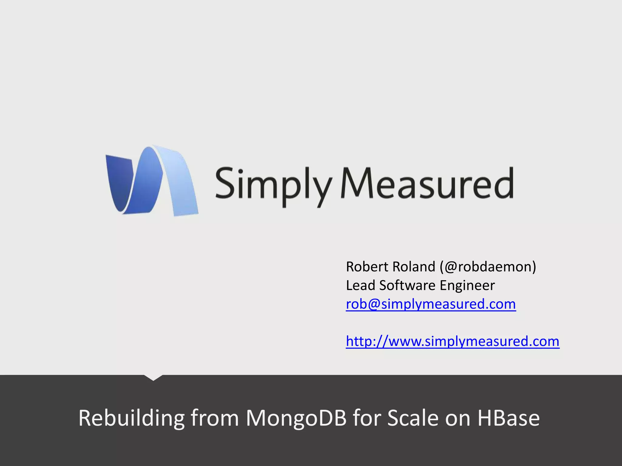 The document discusses Simply Measured's migration from MongoDB to HBase for storing social media analytics data. Simply Measured initially used MongoDB but encountered scaling issues as their data grew beyond 10TB. They migrated to HBase using a dual write approach to ensure accuracy. HBase provided better performance and scaling capabilities. The migration process and lessons learned are described, including schema design in HBase and ongoing improvements to the system.