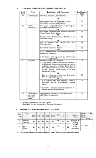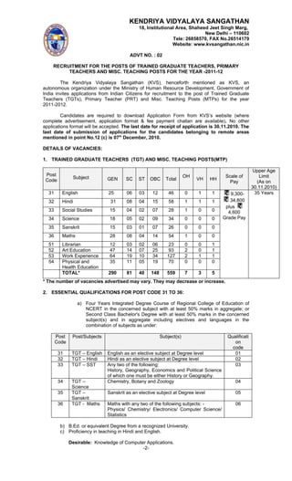 This document announces vacancies for teaching positions at Kendriya Vidyalaya Sangathan schools for the year 2011-2012. It provides details on the application process including downloading the application form from the KVS website, payment of a 750 rupee fee, and sending the completed application and supporting documents by ordinary post by November 30, 2010. The positions include Trained Graduate Teachers for subjects like English, Hindi, Science, and Math, as well as Primary Teachers and other teaching roles. Candidates must meet the specified educational qualifications for the positions and the document provides those qualifications.