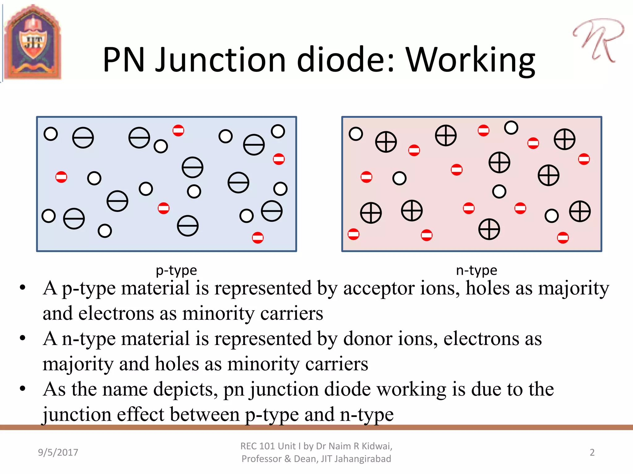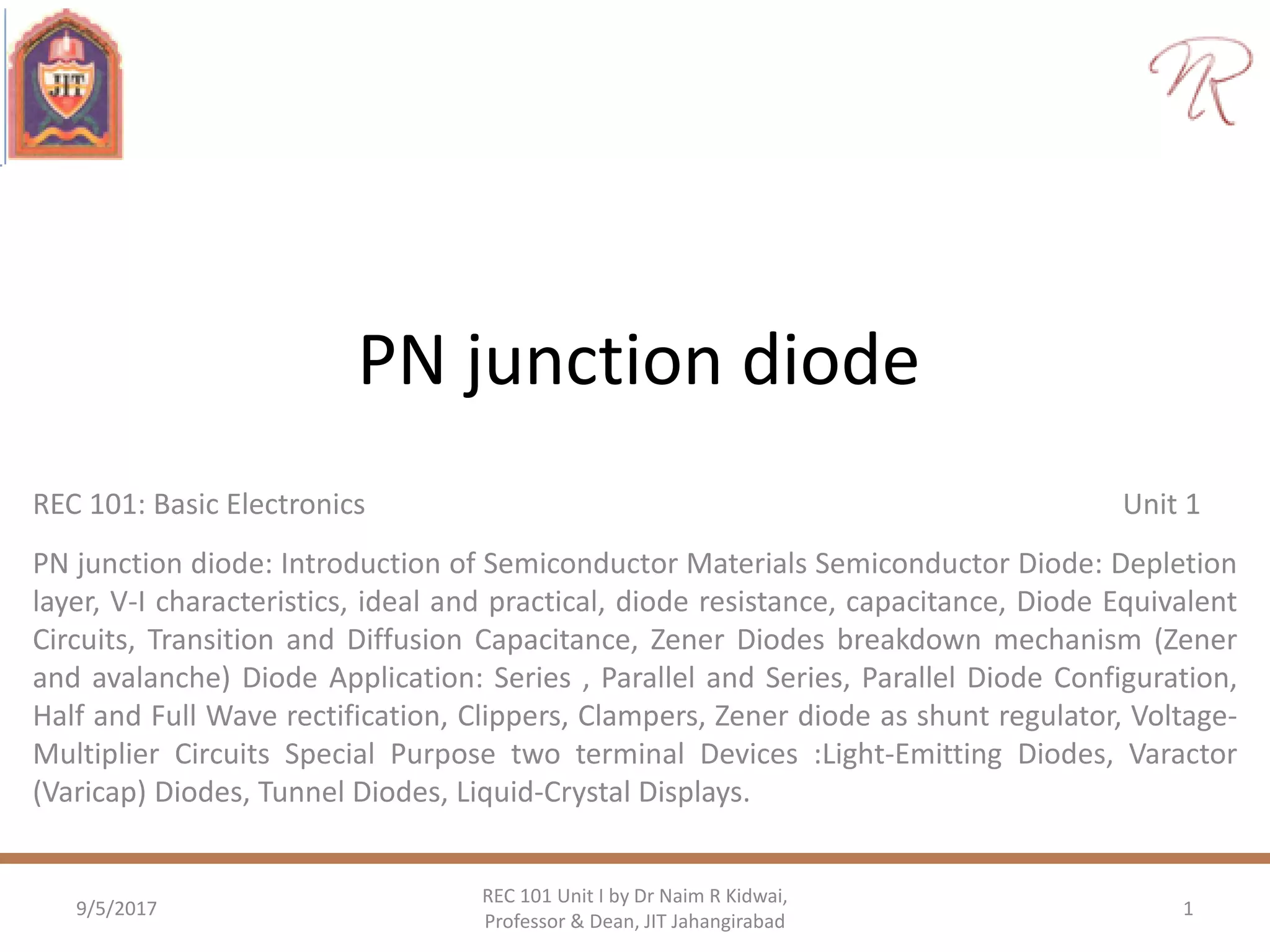 This document covers the fundamentals of PN junction diodes, detailing their construction, operating principles under various bias conditions, and their electrical characteristics. It also discusses special-purpose diodes such as Zener, LED, varactor, and tunnel diodes, including their mechanisms, applications, and behaviors in electronic circuits. The content is aimed at providing an understanding of diode behavior in both ideal and practical scenarios within basic electronics.