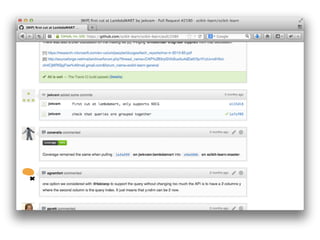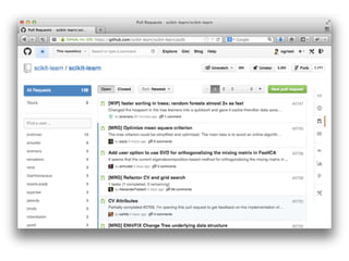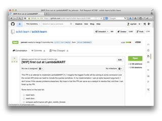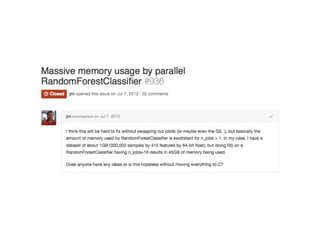 This document provides an overview of machine learning and the scikit-learn library. It discusses predictive modeling using historical data to build executable models for making predictions on new data. It describes how scikit-learn provides machine learning algorithms and tools through a simple API using Python, NumPy and SciPy. It highlights improvements in scikit-learn 0.15, including reduced training times for ensemble methods and optimized memory usage. It demos income classification using scikit-learn with Census data in an IPython notebook.