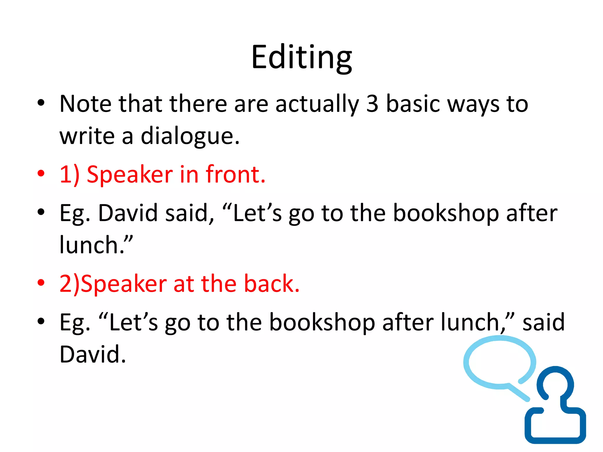 1) Three ways to structure dialogue - with the speaker first, last, or in the middle.