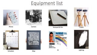 This equipment list for a shoot at Freesia Way, Cringleford includes items for photography like a phone camera, tripod, and lighting as well as props like a moped, costume, and helmet. It also notes necessities for access like a toilet and supplies for technical issues like internet, a laptop, and a socket.